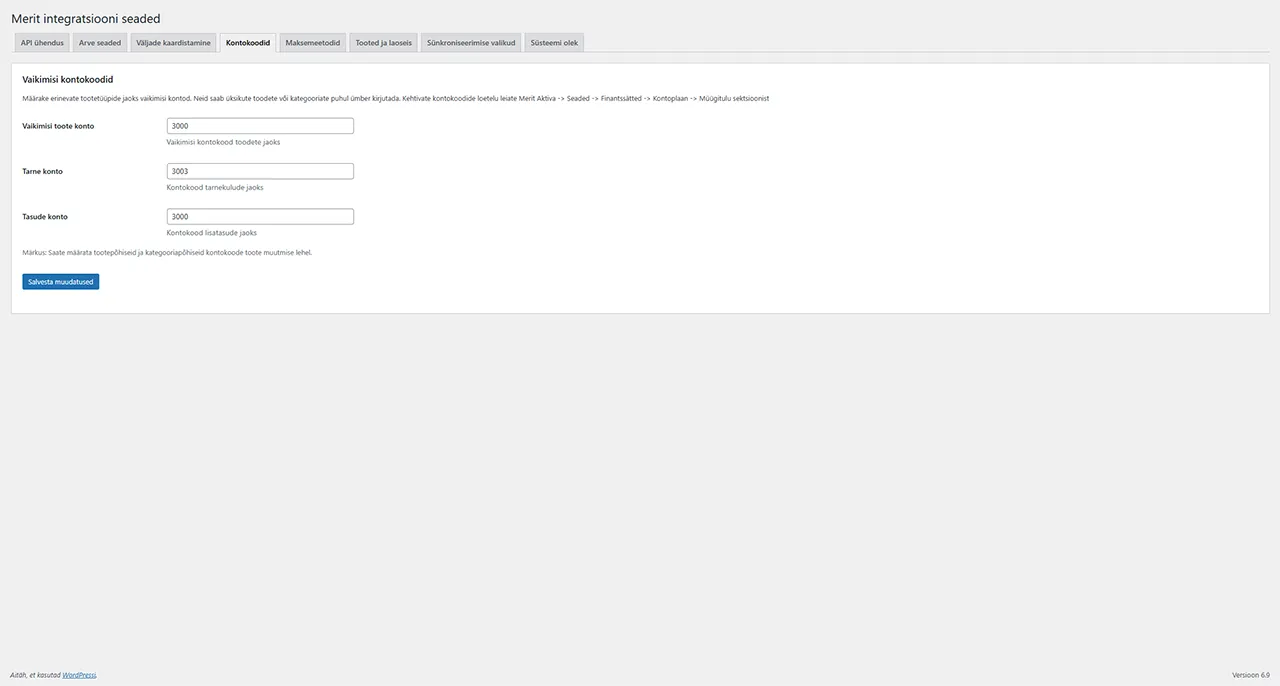 - Vaikimisi pearaamatu kontokoodid toodetele, transpordile ja tasudele